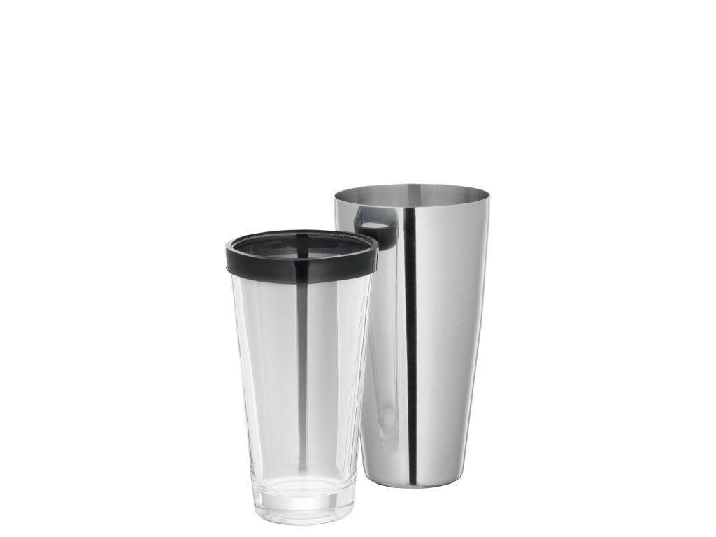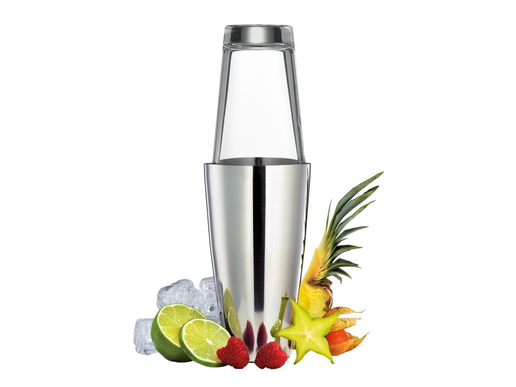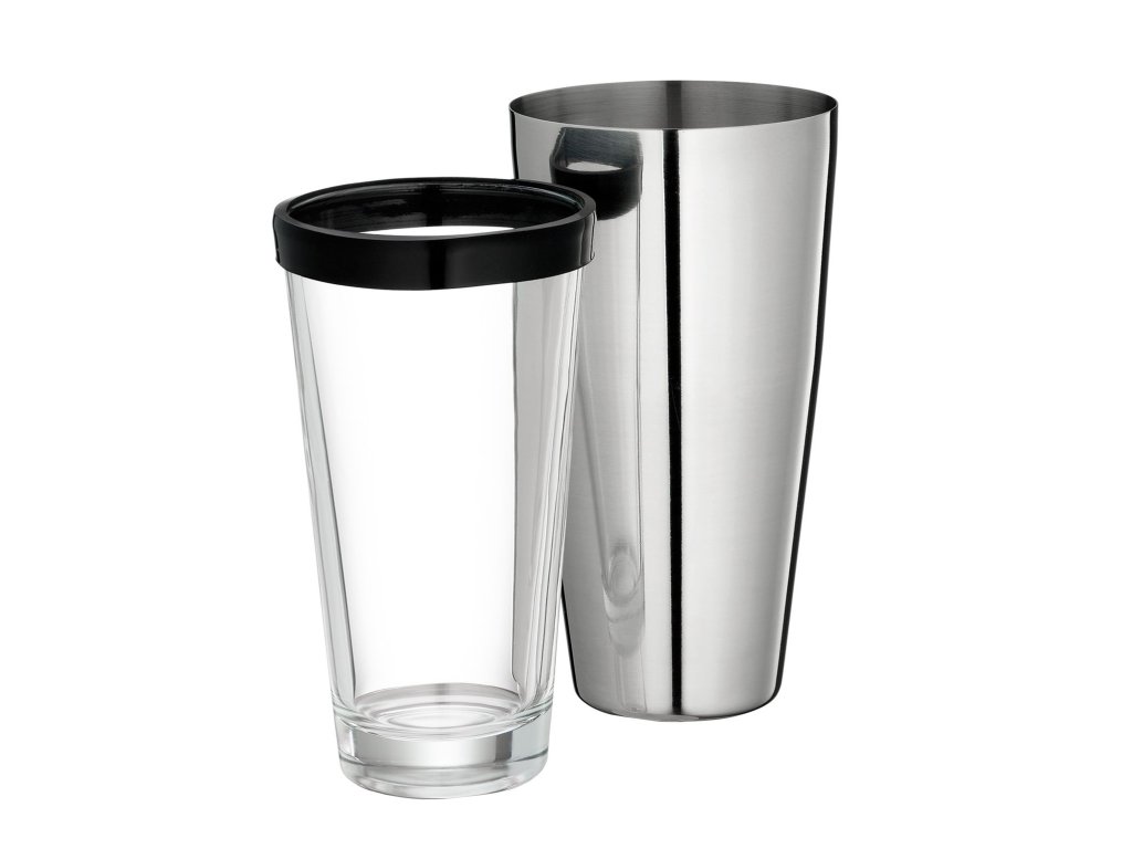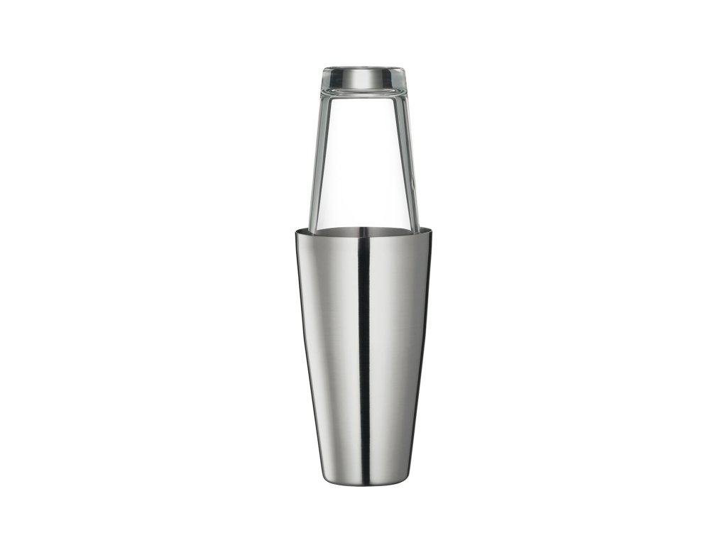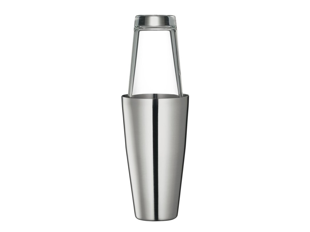 Barmanský dvoudílný shaker vyrobený z nerezové oceli a skla.