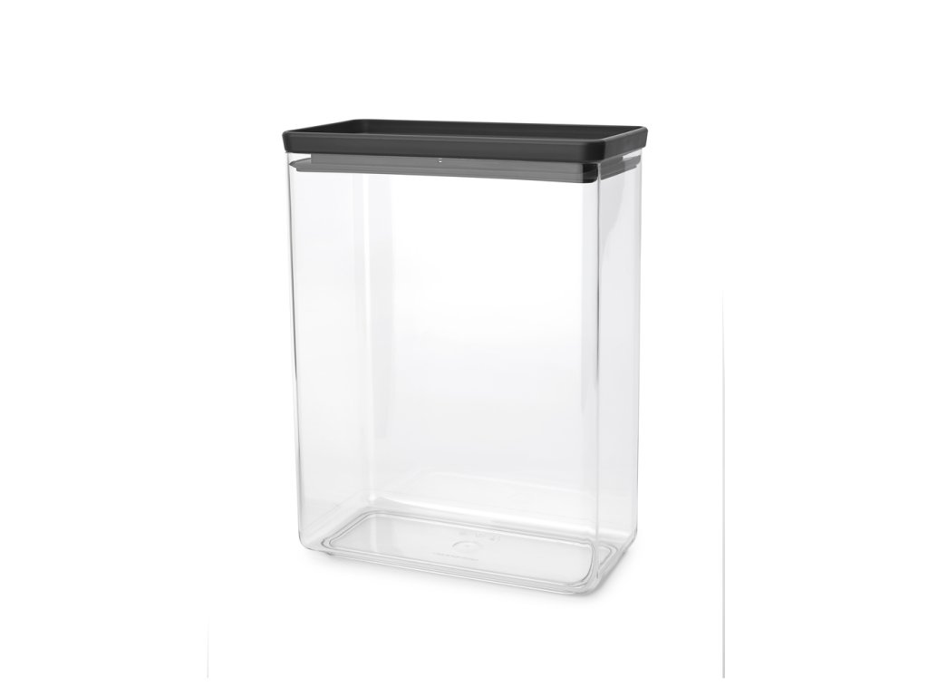 Dóza Square - objem 5,4 L, materiál plast bez BPA, hranatý tvar, stohovatelná dóza, průhledné tělo, tmavě šedé víko.