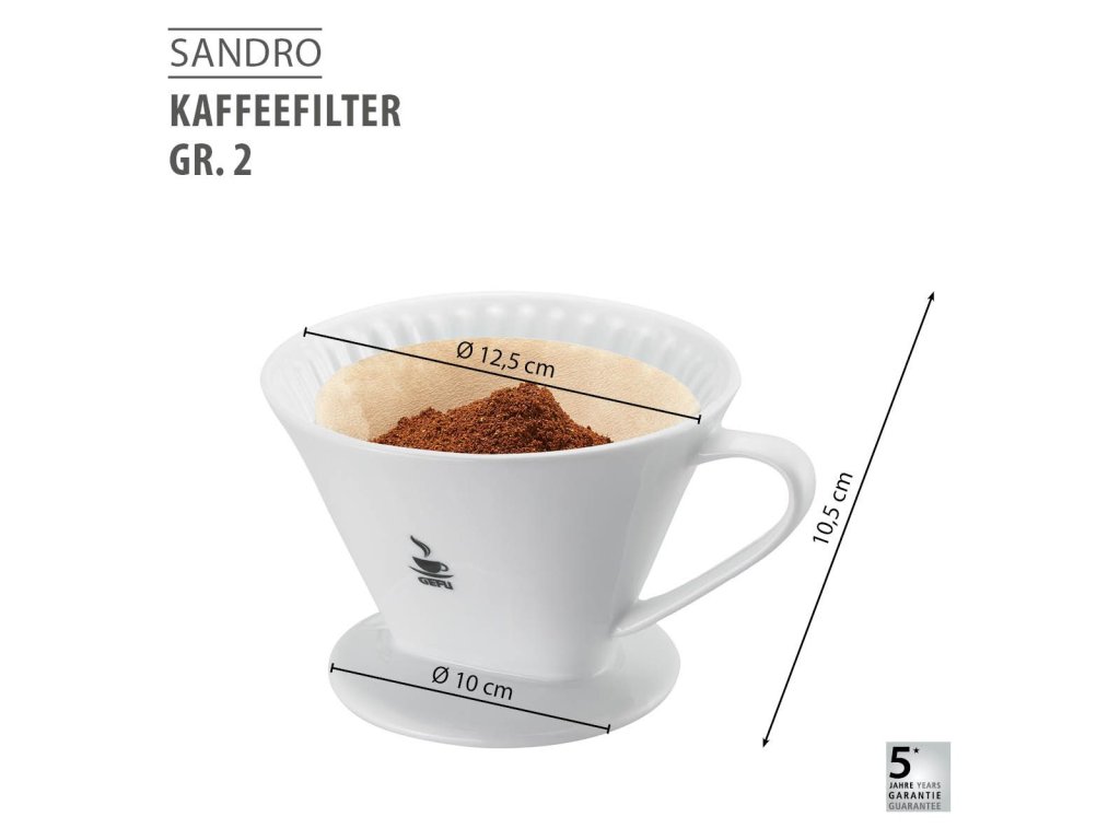 Káva stisknutím tlačítka – jistě, plně automatické kávovary se stávají stále běžnějšími. Zároveň ale předpovědi trendů předpovídají renesanci ručně vařené filtrované kávy! A proto jsme vytvořili porcelánový kávový filtr SANDRO velikosti 2: Je navržen tak, aby se do něj vešly standardní papírové filtrační sáčky velikosti 2. Do filtru se přidá mletá káva, nechá se nabobtnat v troše horké vody a poté se postupně zalévá horkou vodou. Bílý porcelánový filtr je samozřejmě vhodný do myčky nádobí!