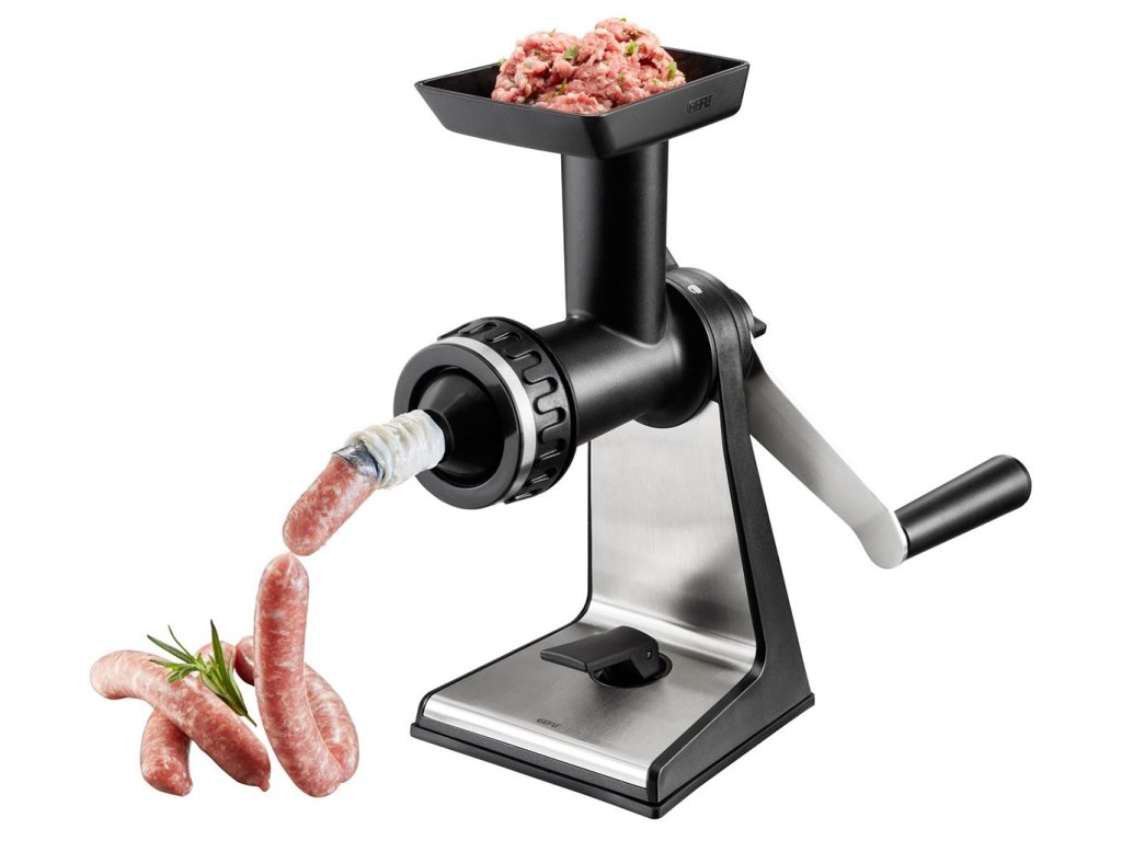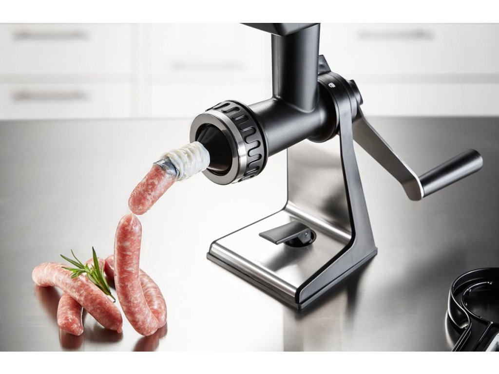 Mletí masa nebo zeleniny je s tímto multifunkčním mlýnkem na maso snadné a bez námahy. Sofistikovaná technologie, jako je speciálně navržený šnek, samoostřicí křídlový nůž a vnitřní závit, zajišťují optimální výsledky. Součástí dodávky je trychtýř na klobásy, který plní nejen klobásy, ale snadno plní i cannelloni a nástavec na sušenky dokonale tvaruje těsto na sušenky. Přísavka nebo alternativně stolní svorka, kterou lze připevnit na pracovní desky nebo stolní desky o tloušťce až 8 cm, zaručuje stabilitu. Posunovač, který lze také použít k utahování a povolování převlečné matice na mlýnku na maso, zajišťuje kompletní zpracování.