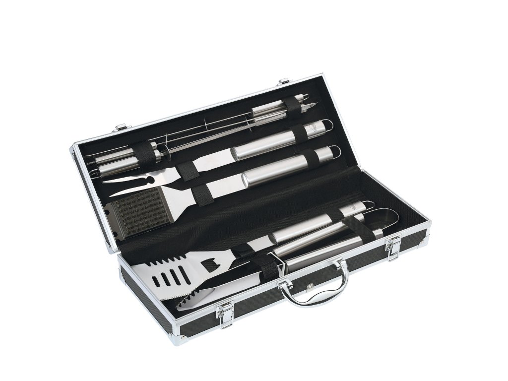 Příslušenství ke grilování z nerezové oceli čeká na své použití ve stylovém černém hliníkovém kufříku.Set se skládá z:Vidlička: 42 cmObracečka: 42 cmKleště: 42 cmKartáč na grilování: 42 cm4x špejle: 42 cm