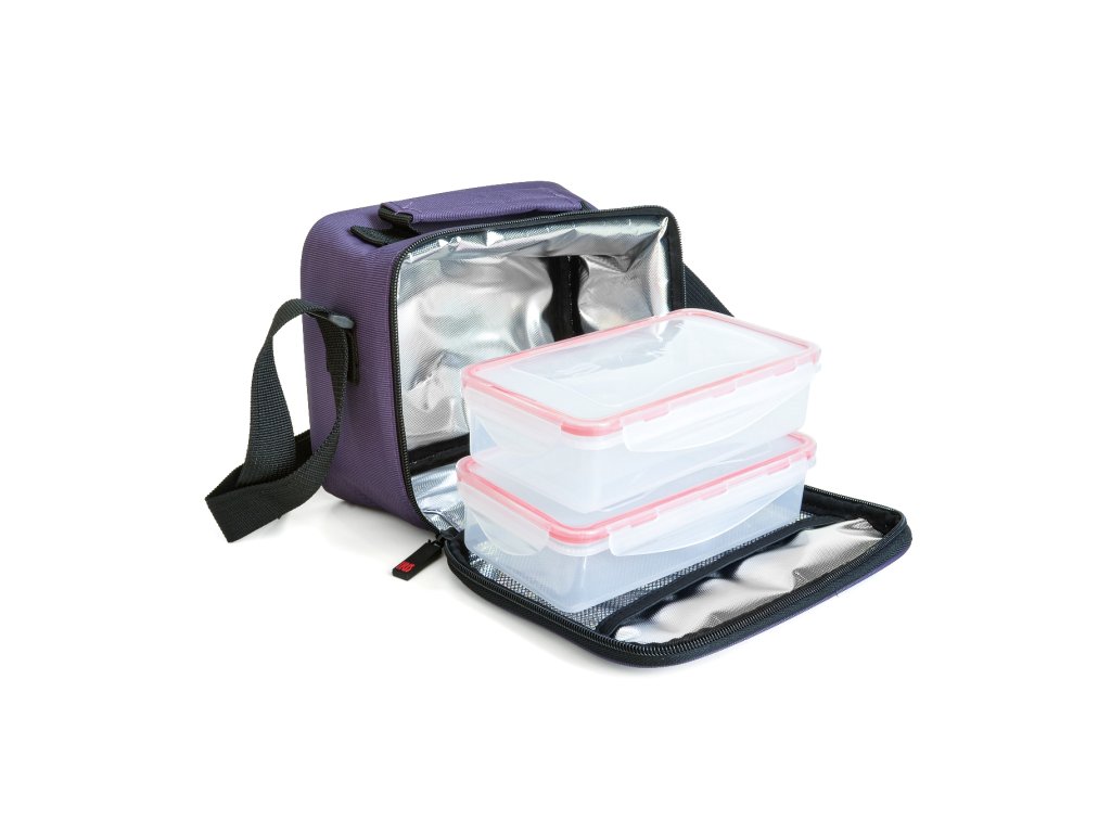 Taška Lilac obsahuje dvě plastové nádoby o objemu 0,6l a 0,8l, do kterých si můžete vzít jídlo s sebou. Jsou 100% hermetické; vhodné do myčky nádobí a mikrovlnné trouby; bez BPA. Naše taška pojme vše, co potřebujete ke snídani, obědu nebo svačině.