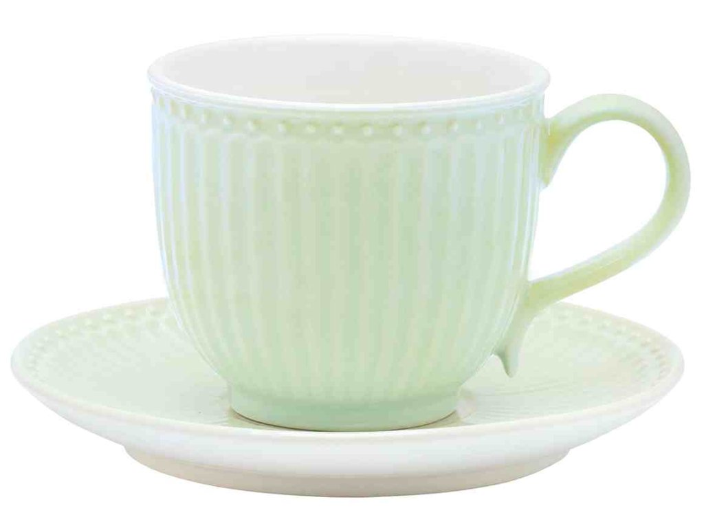 Keramický šálek a podšálek Alice Pale Green je součástí kolekce Alice dánské značky GreenGate