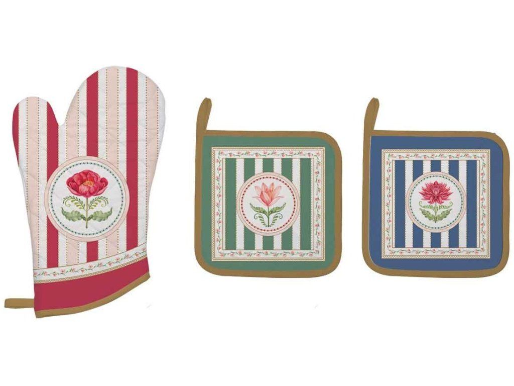 Elegantní kuchyňská rukavice a chňapky skvěle doplní vaši kuchyň a přinesou vám radost při přípravě, vaření a podávání jídla. Sada Flowery obsahuje půvabnou kuchyňskou rukavici a dvě chňapky s květinovým motivem, s praktickým poutkem pro snadné zavěšení. Vyrobeno ze 100% bavlny a lze prát v pračce na 40 °C.