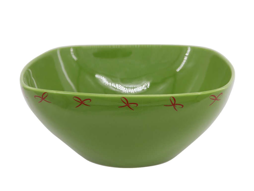 Zelená keramická mísa hranatého tvaru na zeleninový nebo bramborový salát. Okraj mísy je ozdoben červenými mašličkami. Díky slavnostnímu dekoru můžete mísu použít na štědrovečerní bramborový salát.