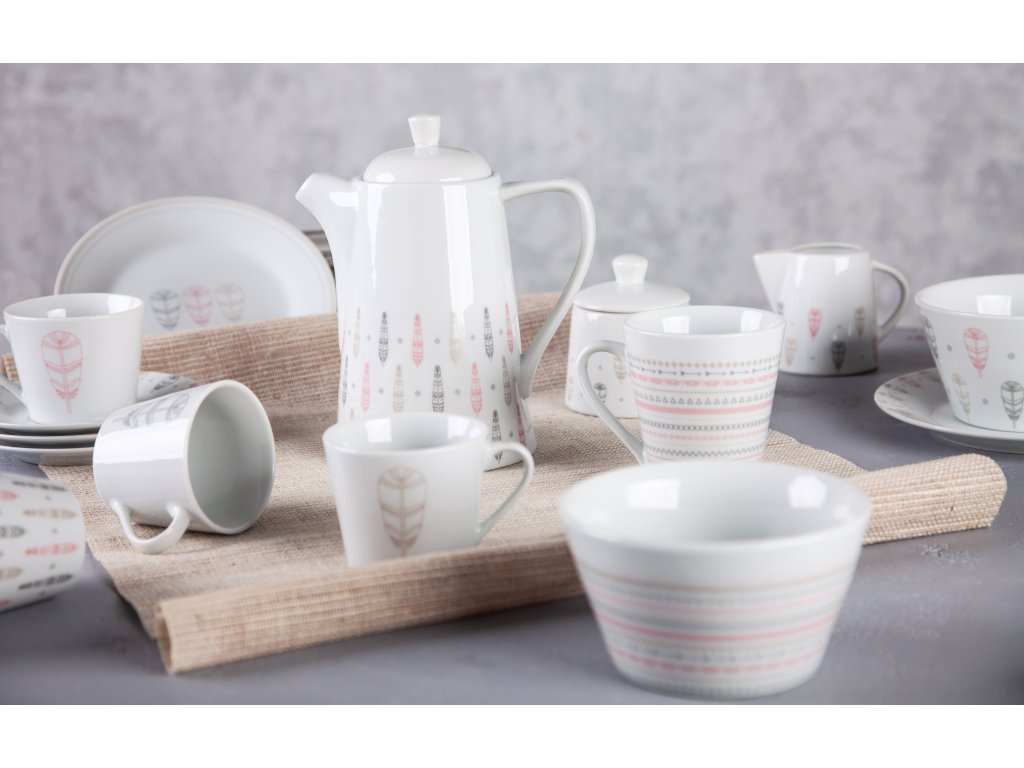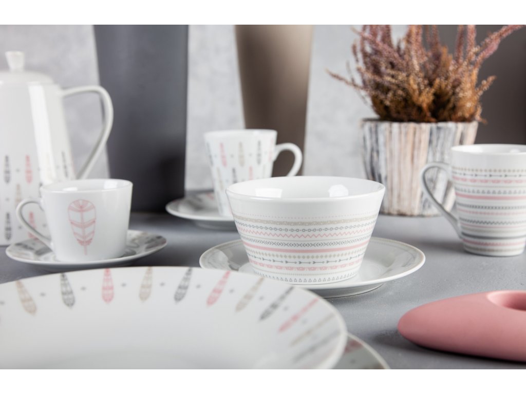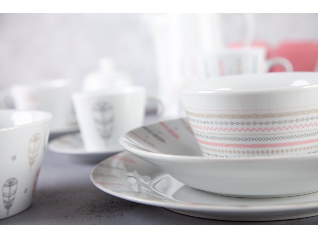 Hravá kolekce v indiánském stylu. Klasická kulatá jídelní souprava s širším okrajem, zdobená indiánskými motivy v zemitých barvách - béžová, šedá, růžová.