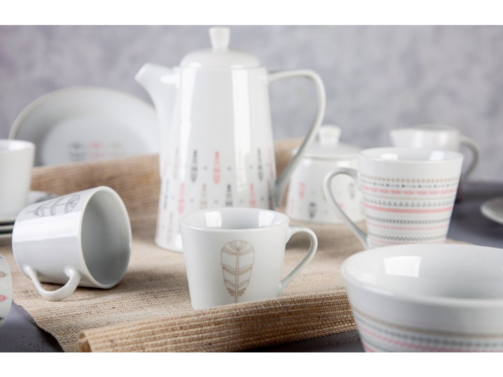 U této kolekce Vám návrháři české značky by inspire ponechali prostor pro Vaší hravost a tvořivost. Dezertní talíř, čajový hrnek a misku pro Vás máme ve dvou dekorech - pírka a symboly totemu.