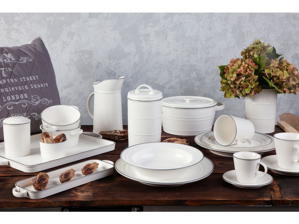 Design, který si pohrává s netradiční kombinací tvaru a materiálu. Tvar tak typický pro smaltované nádobí našich babiček a použitý materiál jakostní porcelán, působí mile a vlídně. Porcelánová miska má smetanový nádech a elegantní šedý proužek jen podtrhuje kontrast křehkosti a retro tvaru „kovového“ nádobí. Designová miska v nadčasovém provedení. Moderní miska od české značky by inspire...porcelán s českou duší.
