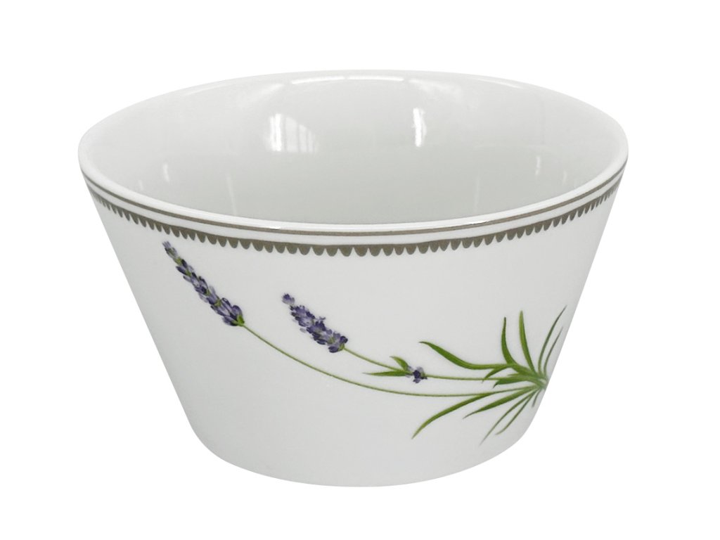 Miska na müsli s jemným zdobeným pruhem v barvě taupe v kombinaci s dekorem levandule. Levandule je již klasikou a stále funguje. Není se čemu divit, při pohledu na levanduli se okamžitě přenesete do Středomoří, připomene se vám atmosféra francouzského pobřeží a vybaví nekonečná pole zahalená do fialové barvy a překrásné vůně.