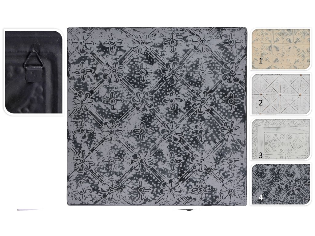 Kovový obraz na zeď s vytlačenými 3D geometrickým dekorem v bílé barvě s jemnou patinou.