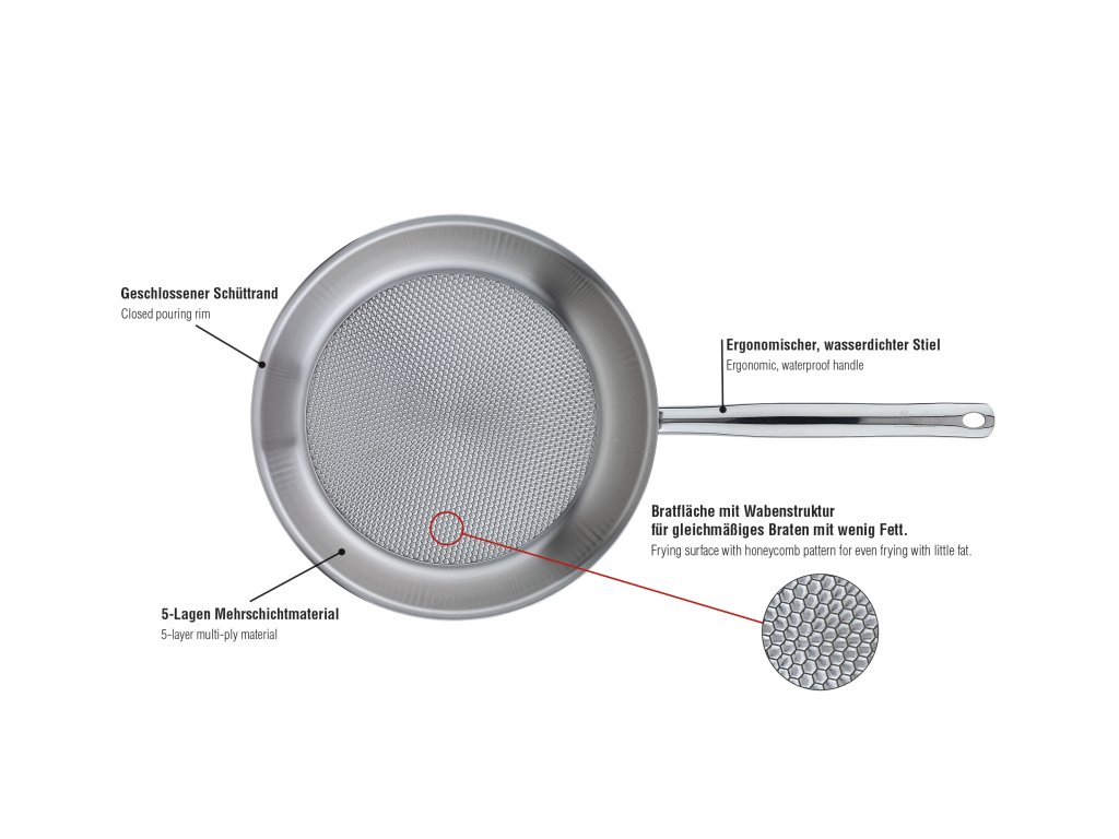 - Vysoce kvalitní nerezová ocel: Pánvička je vyrobena z prvotřídní nerezové oceli, která zajišťuje dlouhou životnost a odolnost proti korozi.