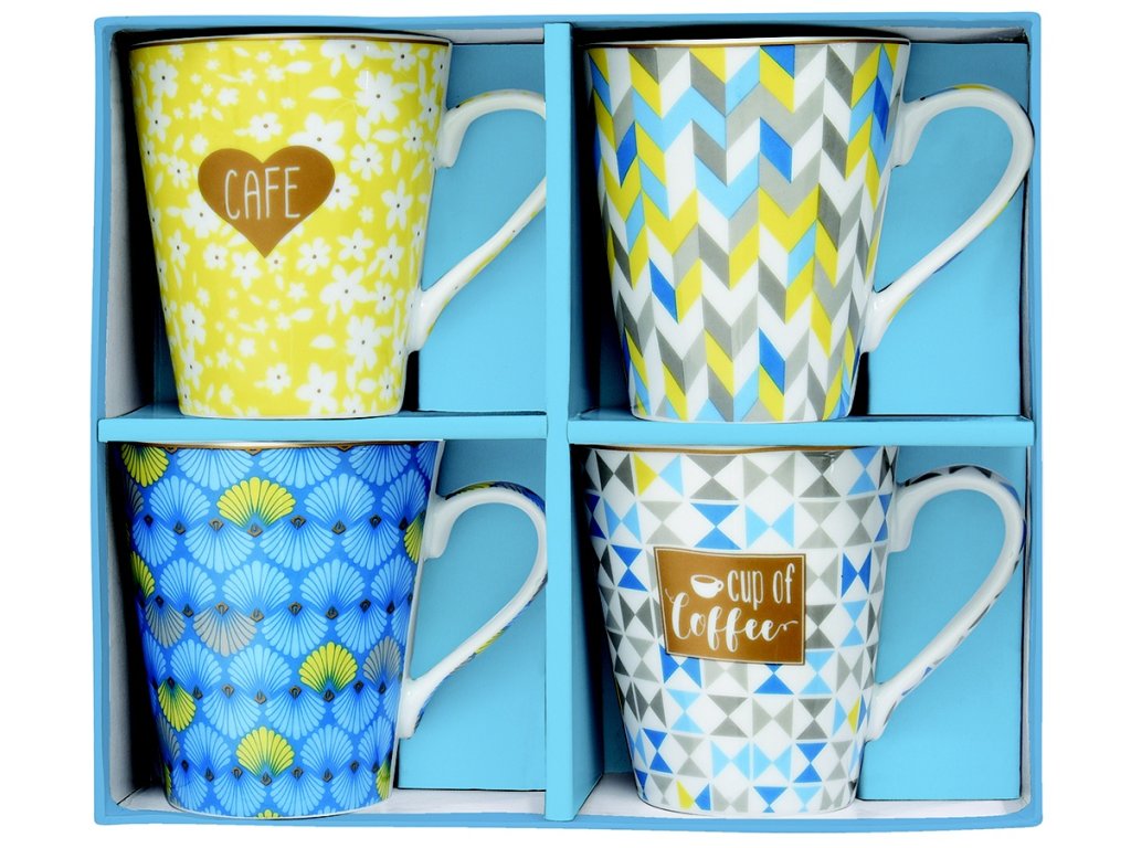 Sada porcelánových hrnků Cup Of Coffee se žlutými a modrými hrnky. Objem hrnků je 300 ml. Čtyři čajové hrnky jsou zabaleny v dárkové krabičce stejného motivu.