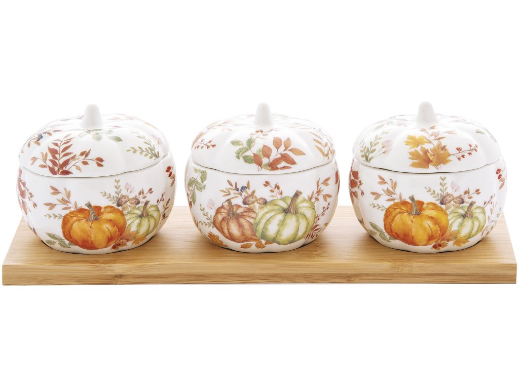Porcelánové misky na dipy Harvest s víčkem a porcelánovými lžičkami na bambusovém tácku s podzimními motivy představují krásný a praktický doplněk pro každou kuchyni nebo jídelní stůl. Jejich detailní design a kvalitní materiály zajišťují, že jsou nejen funkční, ale také esteticky příjemné. Tento set je ideální pro podzimní oslavy, rodinné večeře nebo jako stylový dárek pro vaše blízké.