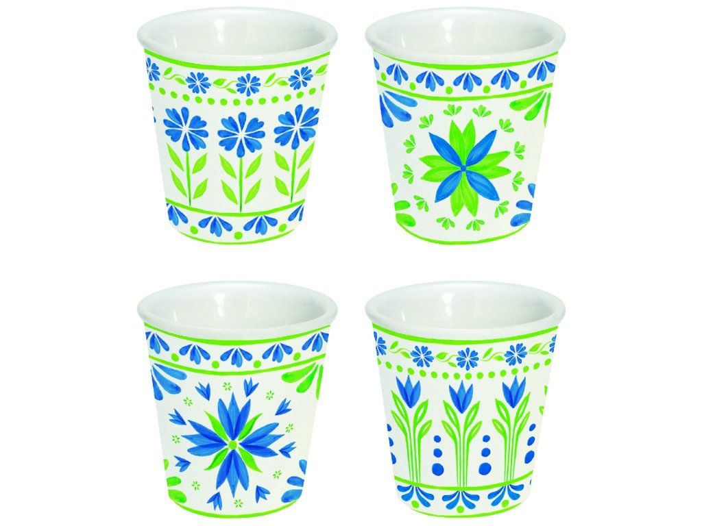 Sada porcelánových pohárků Flowers Garden na espresso. Hrnky s modrými květy jsou o objemu 100 ml a zabaleny v dárkové krabičce stejného motivu. Balení obsahuje čtyři kusy.