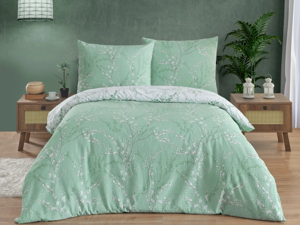 Povlečení je vyrobeno z velmi jemné 100% bavlněné tkaniny o plošné hmotnosti tkaniny 130g/m2. Krepování je vytvořeno pomocí speciální úpravy. Díky tomuto krepování se povlečení nemusí žehlit. Tkanina má vysokou hustotu velmi jemných přízí a pro tyto své vlastnosti je velice jemná a příjemná na omak. Ložní povlečení je vyrobeno s rozměrovou rezervou pro vysrážení po vyprání. Povlečení je vyrobeno v ČR s oblíbeným zipovým uzávěrem.