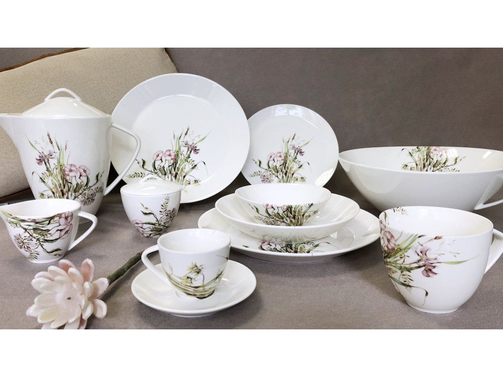 I zde se čeští návrháři nechali inspirovat přírodou, tentokrát však vznikl trochu výraznější dekor. Dekor kytice divokého lučního kvítí, to je kolekce Harmonie. Jedná se o porcelán Noble. Můžete tedy kombinovat s čistě bílým porcelánem a vytvořit tak svou originální jídelní soupravu.