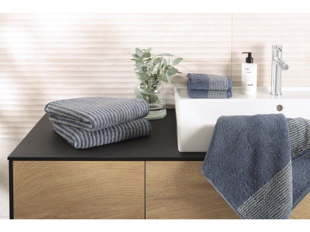 Odstín noční modrá působí hluboce, klidně a elegantně. Připomíná večerní oblohu a vnáší do koupelny pocit harmonie, stability a jemného luxusu. Dvoubarevný pruhovaný vzor dodává ručníku vizuální strukturu, která je výrazná, ale stále nadčasová a snadno kombinovatelná s dalšími textiliemi.