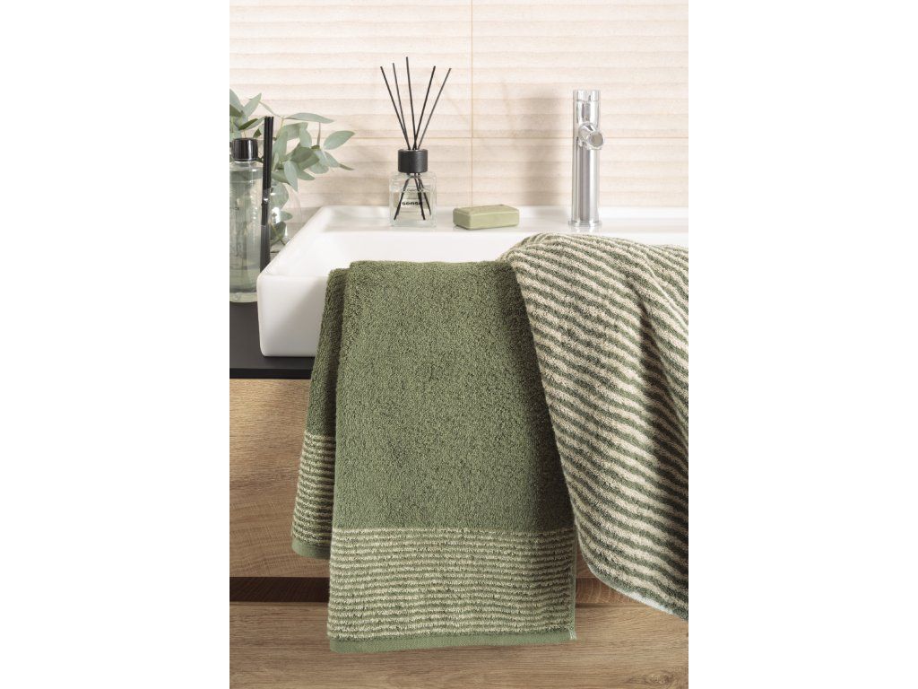 Odstín polní působí přirozeně, zemitě a klidně. Připomíná tóny krajiny, sušených trav a přírodních materiálů, čímž do koupelny vnáší pocit rovnováhy, tepla a nenucené elegance. Dvoubarevné pruhy dodávají ručníku jemnou strukturu a vizuální hloubku, která nepůsobí rušivě a zůstává nadčasová.
