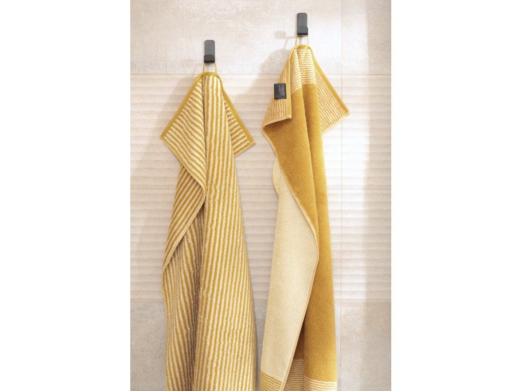 Odstín zlatá působí hřejivě, elegantně a sofistikovaně. Připomíná teplé tóny kovu a světla, vnáší do koupelny pocit luxusu a útulnosti, aniž by byl okázalý. Dvoubarevné pruhy dodávají ručníku vizuální hloubku a rytmus, který zůstává nadčasový a snadno kombinovatelný.