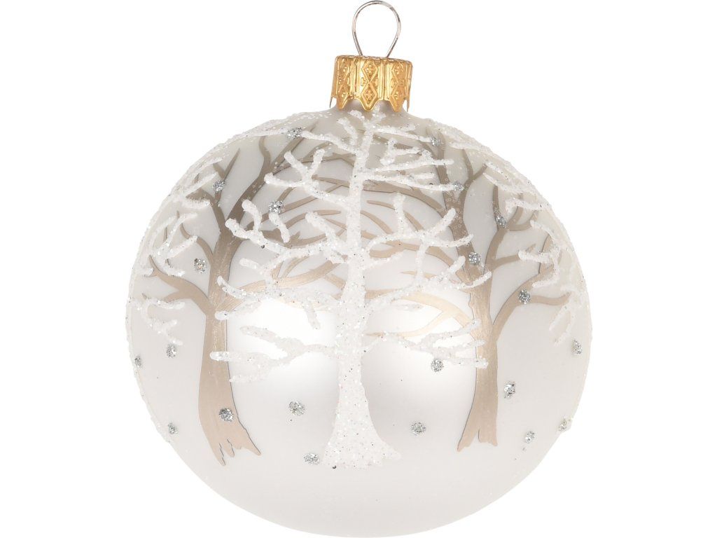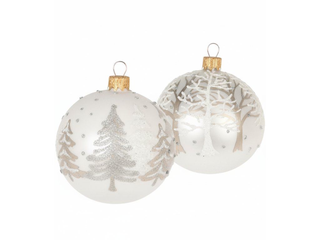 Sada 2 ks - Vánoční koule skleněná se stromky, bílá/perleťová (8 cm)