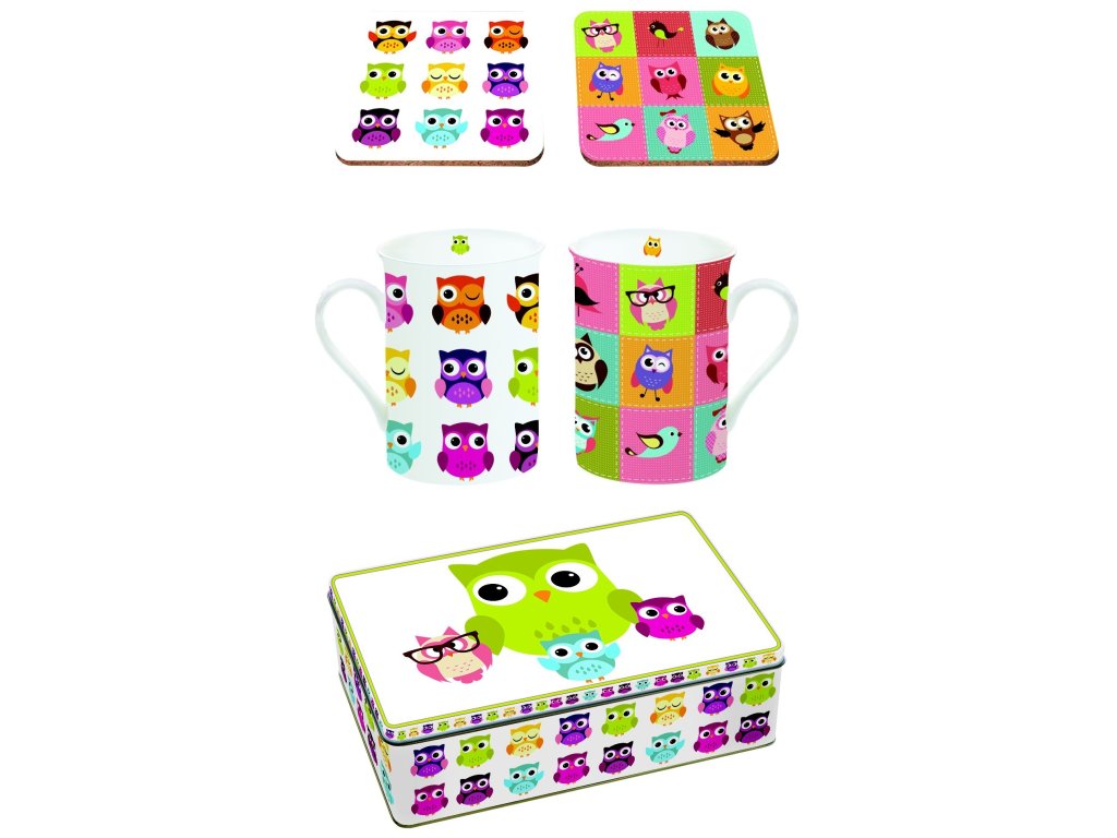 Sada dvou porcelánových hrnků Owls s korkovými podložkami v dárkové plechové krabičce potěší všechny milovníky kávy. Celá dárková sada je s tímto motivem.