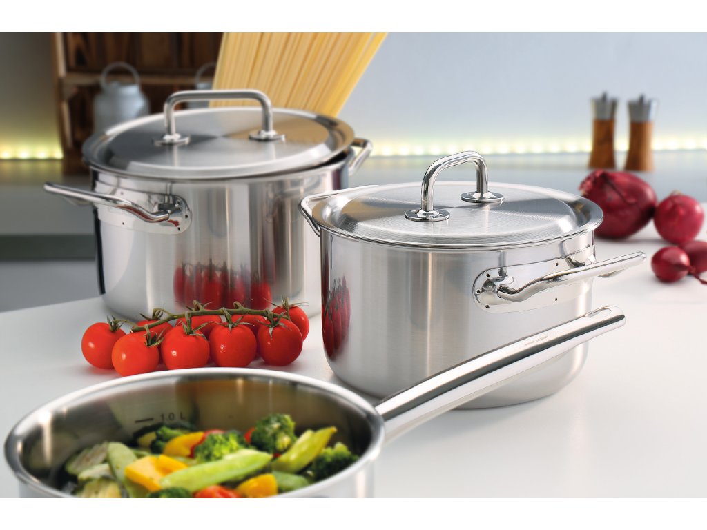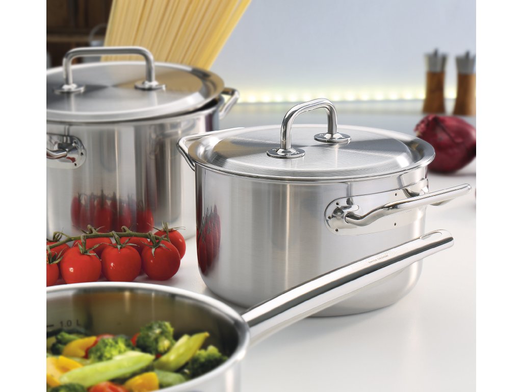 - Vysoce kvalitní materiály: Hrnce jsou vyrobeny z nerezové oceli, která zaručuje odolnost a snadnou údržbu.