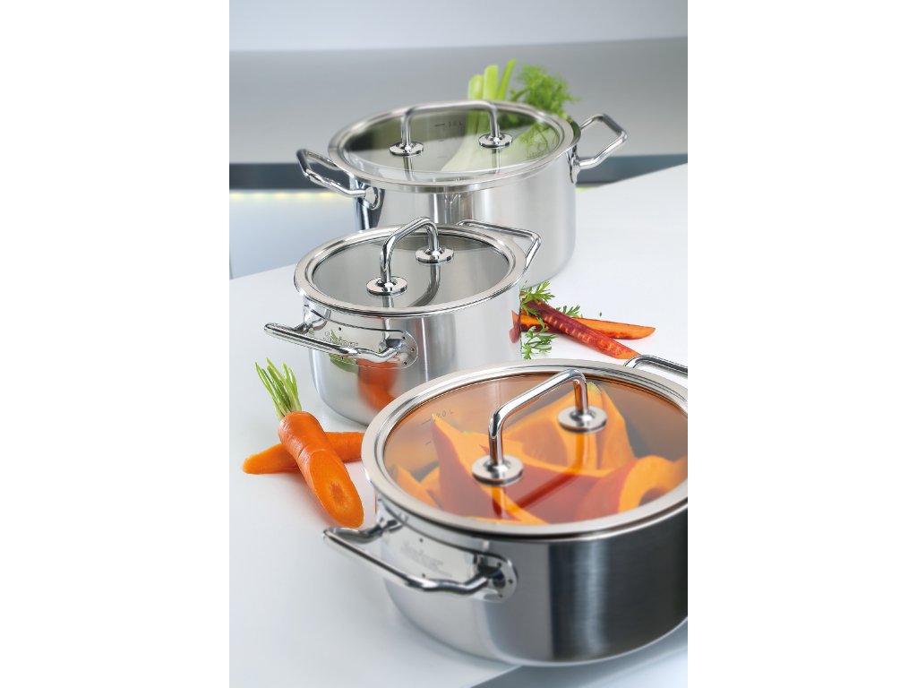 - Kvalitní materiály: Hrnce jsou vyrobeny z odolné nerezové oceli, která zajišťuje dlouhou životnost a snadnou údržbu.