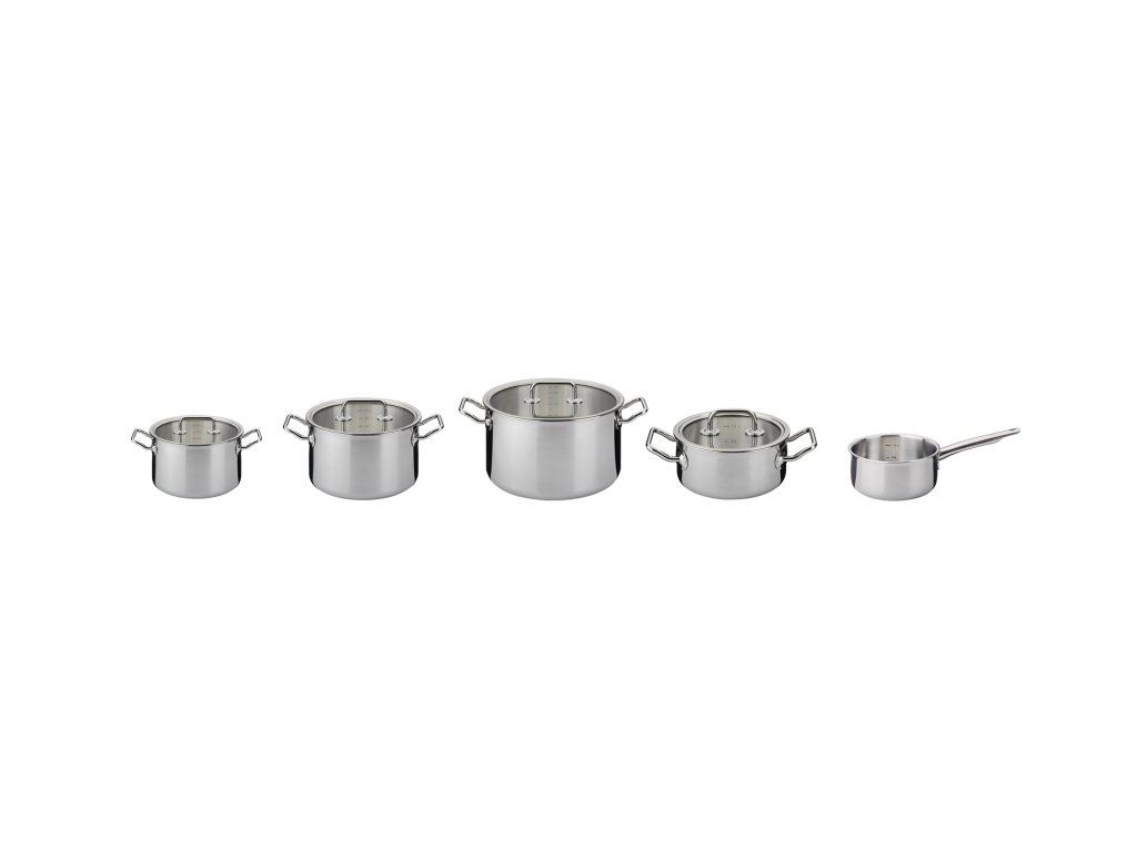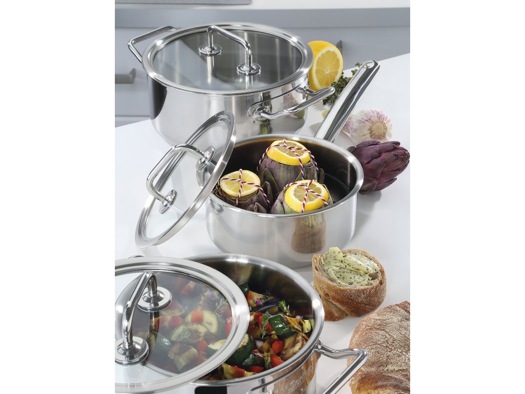 - Kvalitní materiály: Hrnce jsou vyrobeny z odolné nerezové oceli, která zajišťuje dlouhou životnost a snadnou údržbu.