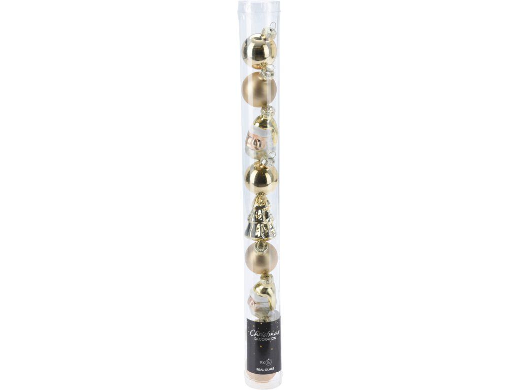 Sada vánočních ozdob obsahuje 9 ks elegantních dekorací o průměru 3 cm, vyrobených z kvalitního skla. Tato sada kombinuje vánoční koule a figurky, které jsou ideální pro vytvoření kouzelné atmosféry na vánočním stromku. Každá ozdoba je opatřena zlatou čepičkou, která dodává luxusní vzhled.