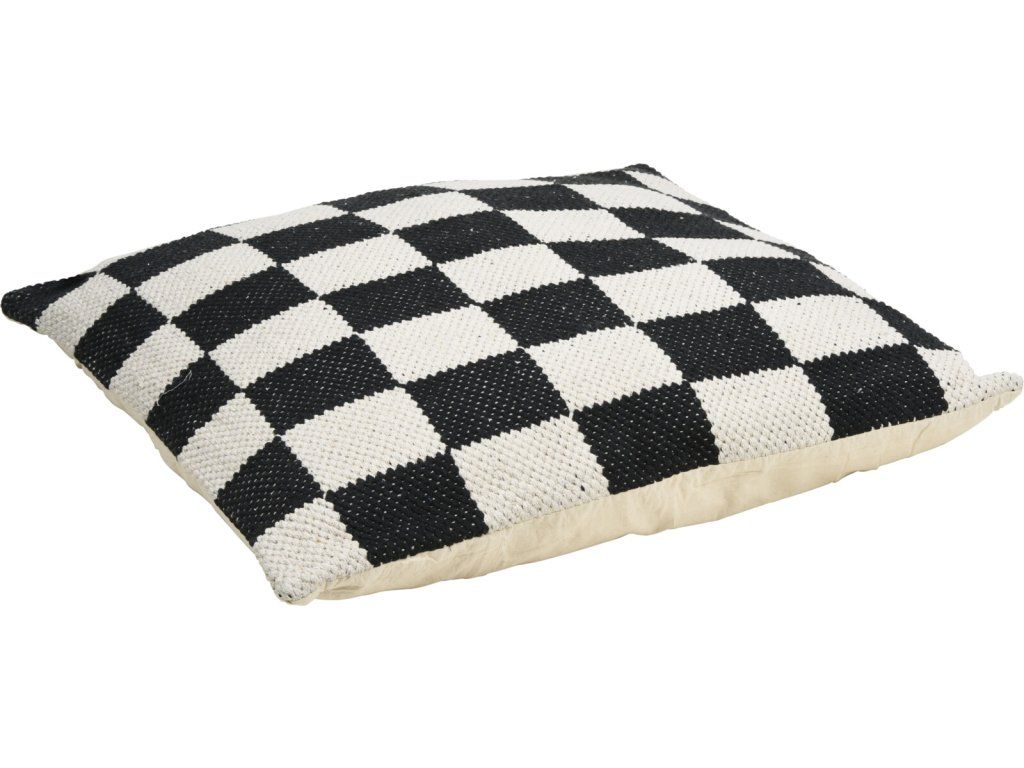 Materiál a design: Polštář je vyroben z pevné bavlny, což zajišťuje pohodlí a příjemný pocit na dotek. Design polštáře představuje šachovnici s černými a přírodními kostkami, což dodává prostoru moderní a výrazný vzhled.