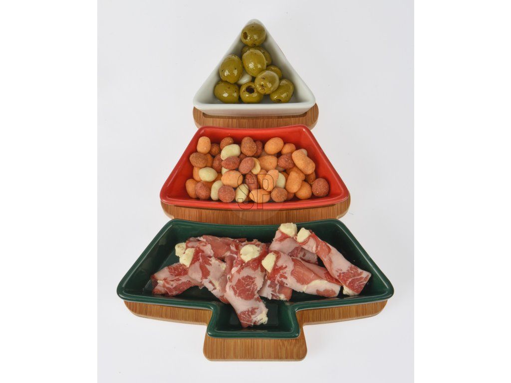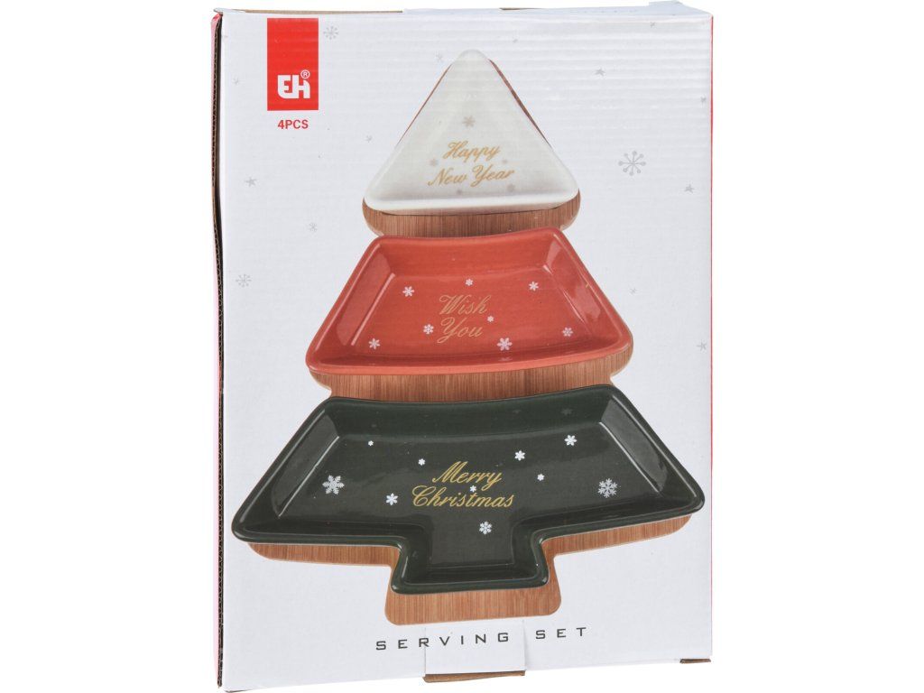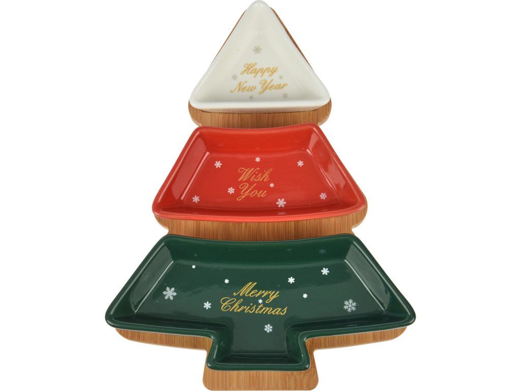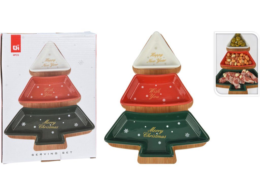 Servírovací sada Stromeček: Bambusový tác a 3 kameninové misky se zlatou (27x20x4 cm)