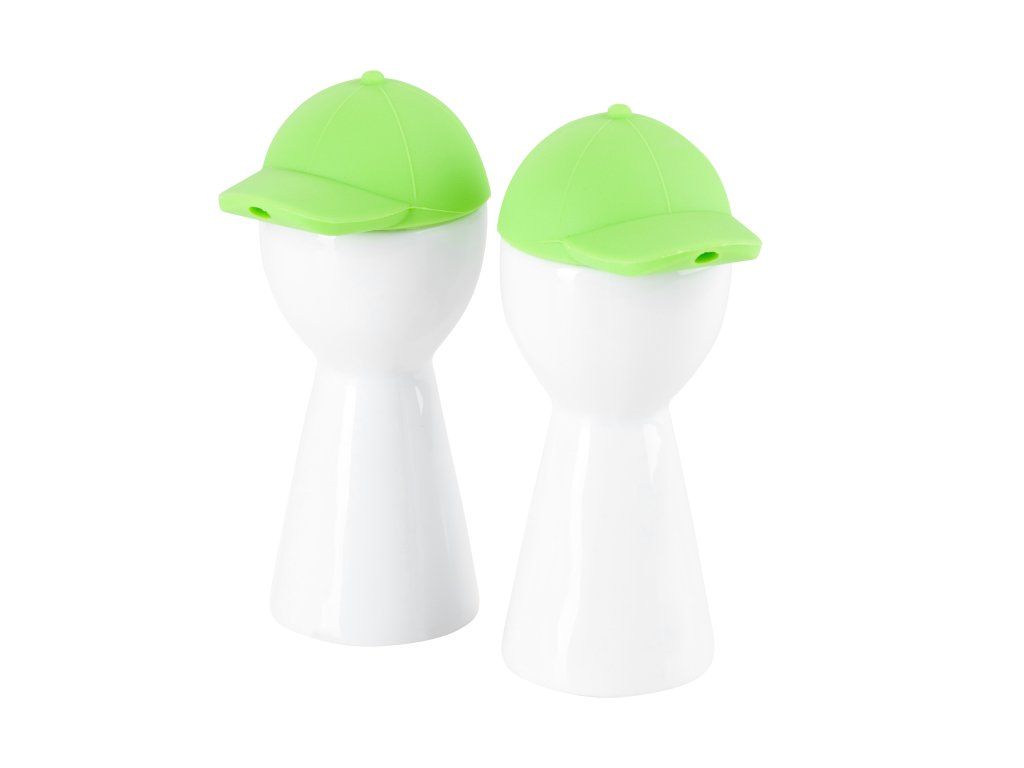 Nádoby na olej a ocet mají porcelánové tělo a silikonové víko v zelené barvě. Silikonové víko je vyrobeno ve tvaru kšiltovky.