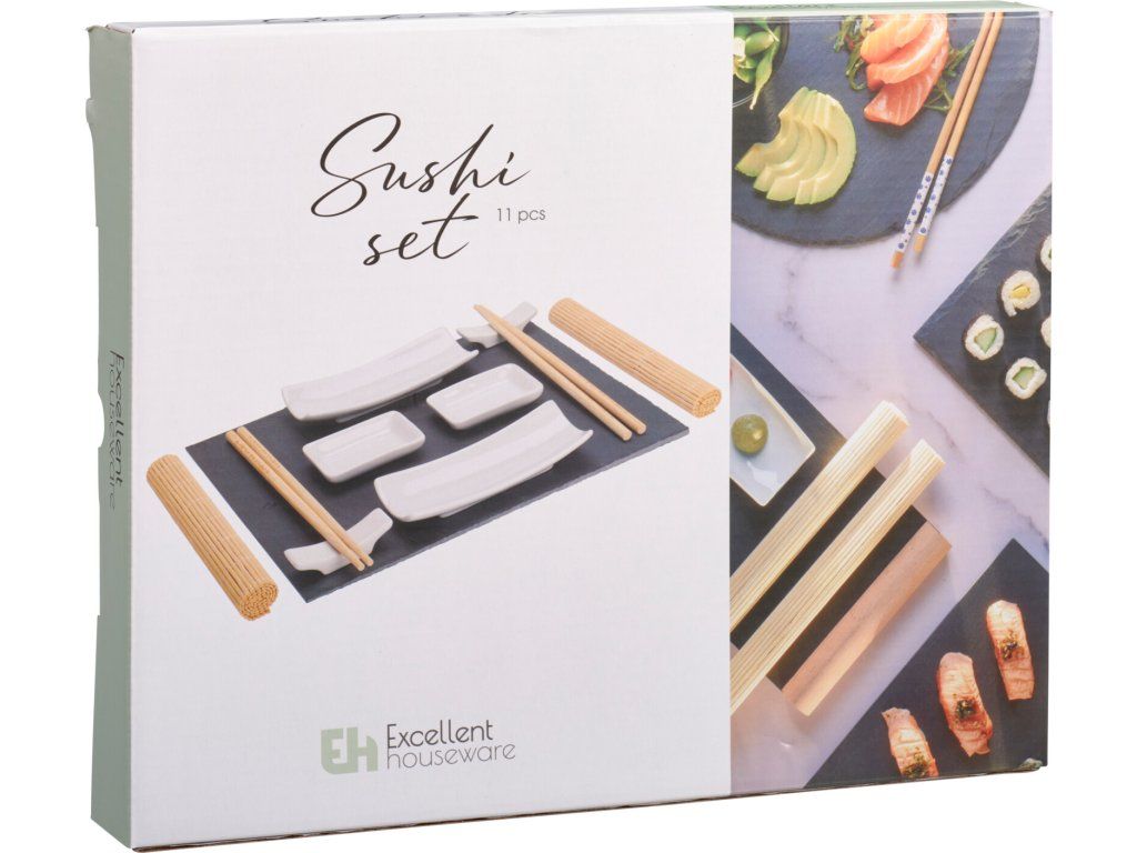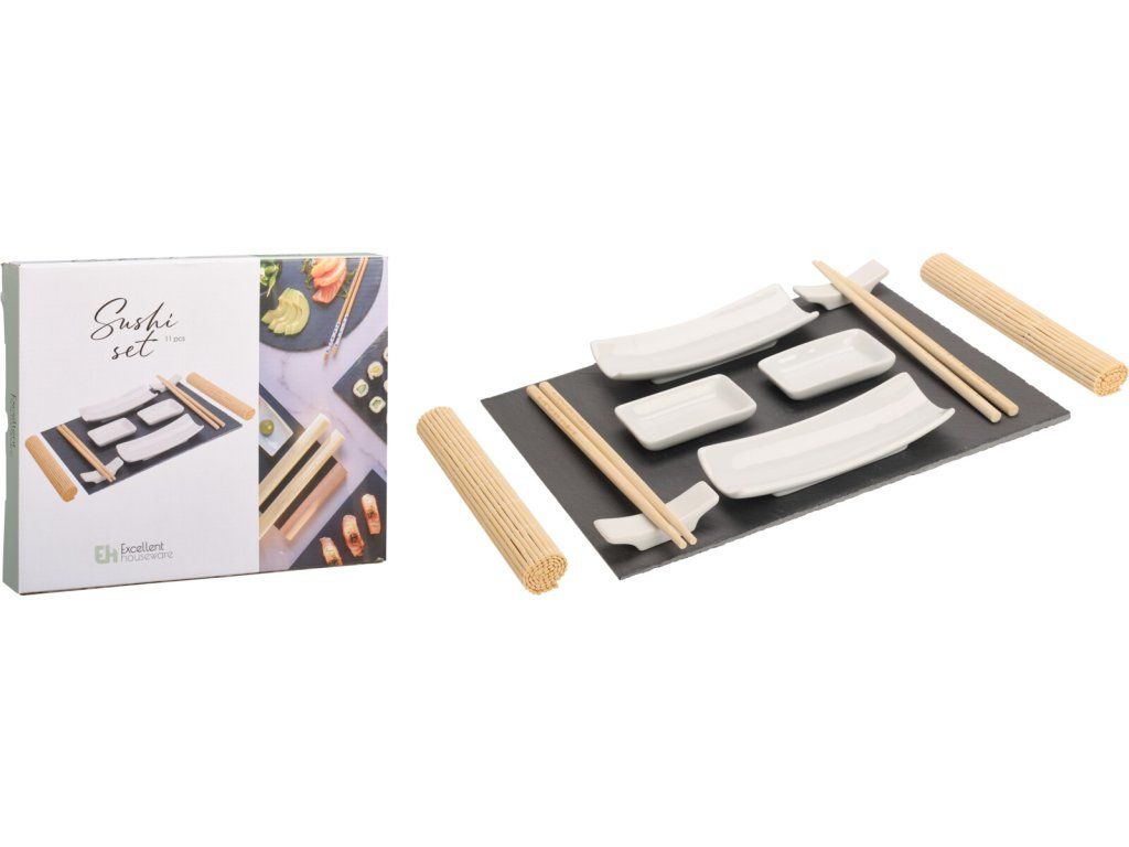 Sushi set ZenStyle 11 ks je kompletní sada pro stylové a autentické domácí podávání sushi, ideální pro milovníky japonské kuchyně i jako elegantní dárkový set. Spojuje přírodní materiály – bambus, porcelán a břidlici – do dokonale vyvážené kombinace estetiky a funkčnosti.