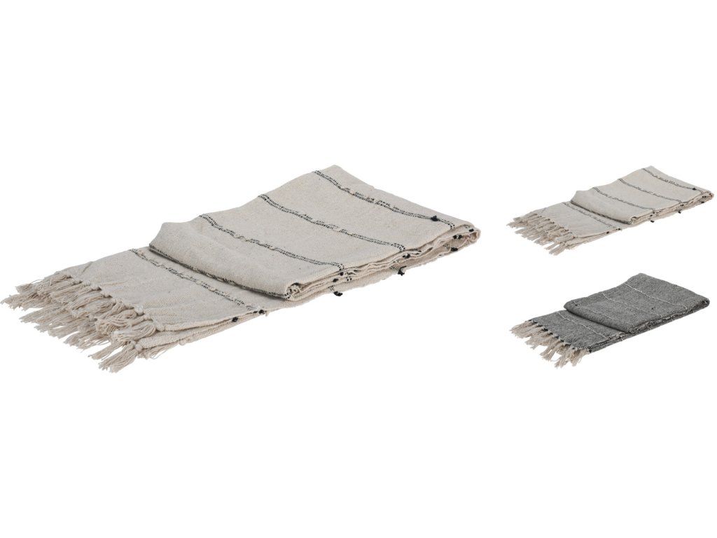 Design: Pléd má béžovou barvu s tenkými černými proužky, které dodávají produktu moderní a elegantní vzhled. Okraje jsou zdobeny třásněmi, což přidává do designu jemný a dekorativní prvek.