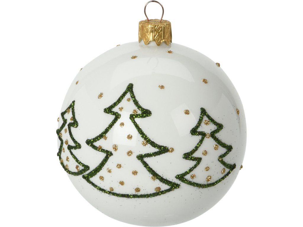Vánoční ozdoba koule o průměru 8 cm je elegantním doplňkem, který ozdobí váš vánoční stromek. Baňka má jemný bílý povrch a je zdobena obrysem vánočního stromku v zelené barvě, který je doplněn drobnými zlatými tečkami. Zdobení zlatými detaily dodává kouli slavnostní a luxusní vzhled, který krásně odráží světlo a přináší vánoční atmosféru do každého interiéru.