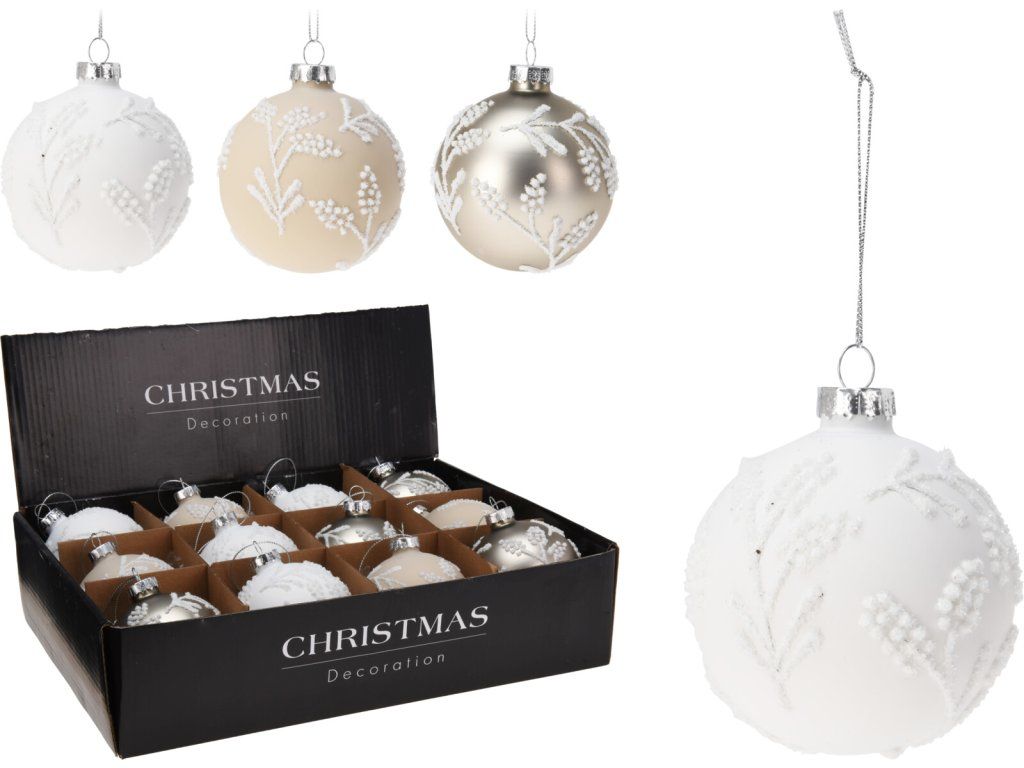 Vánoční skleněná baňka o průměru 8 cm v lesklé bronzové barvě přináší elegantní a sofistikovaný prvek do vaší vánoční výzdoby. Baňka je jemně zdobená reliéfem bílých větviček, které vytvářejí kontrast s lesklým povrchem, a dodávají tak ozdobě výrazný, ale zároveň jemný vzhled.