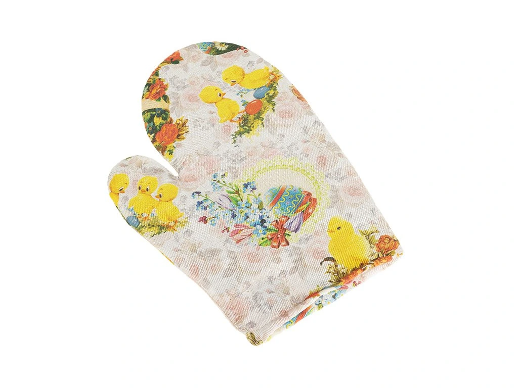 Kuchyňský chňapka je nepostradateným doplňkem pro každou hospodyňku. Je ušita z dostatečně silného materiálu ( výplň tvoří netkaná textilie), díky čemuž se zabrání zbytečnému popálení. Navíc je chňapka opatřena praktickým magnetem a poutkem pro zavěšení. Ve stejném velikonočním designu je možné objednat i ubrus na stůl nebo povlak na polštářek 45x44 cm.