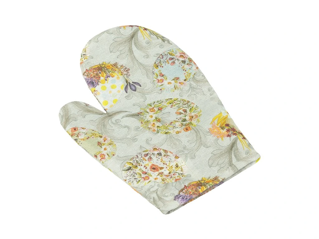 Kuchyňský chňapka je nepostradateným doplňkem pro každou hospodyňku. Je ušita z dostatečně silného materiálu ( výplň tvoří netkaná textilie), díky čemuž se zabrání zbytečnému popálení. Navíc je chňapka opatřena praktickým magnetem a poutkem pro zavěšení. Ve stejném velikonočním designu je možné objednat i ubrus na stůl nebo povlak na polštářek 45x44 cm.