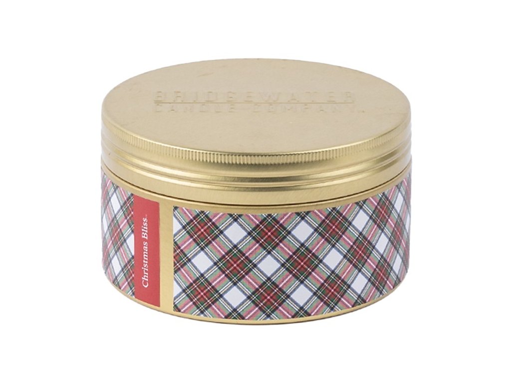 Vylepšete si sváteční atmosféru s naší vánoční tříknotou svíčkou v okouzlující kulaté plechovce s luxusním zlatým povrchem. Tato svíčka, ozdobená klasickým kostkovaným motivem, dodá každému prostoru sváteční kouzlo.