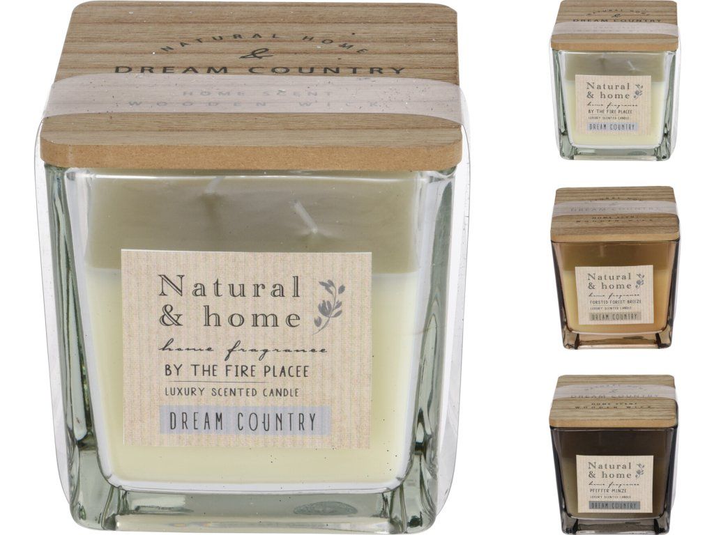 Svíčka je k dispozici ve třech různých barvách skla, každá doplněná unikátní vůní: kouřové sklo s mátou peprnou, šedé sklo s lesním vánkem a transparentní sklo s vůní krbu. Dřevěné víčko dodává svíčce elegantní dotek.