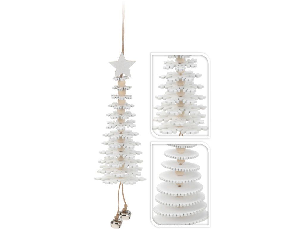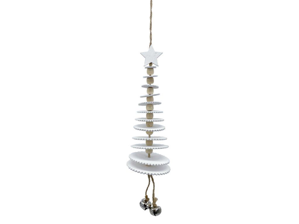 Dřevěný stromek k zavěšení, 12 pater. Na konci závěsné dekorace dvě stříbrné rolničky. Rolničky, rolničky, kdo pak vám dal hlas!!!